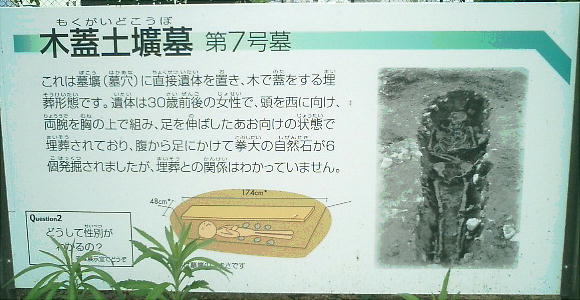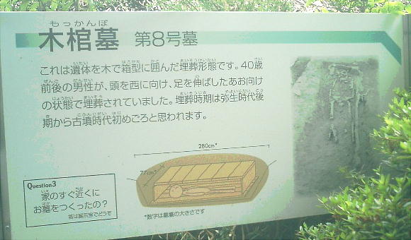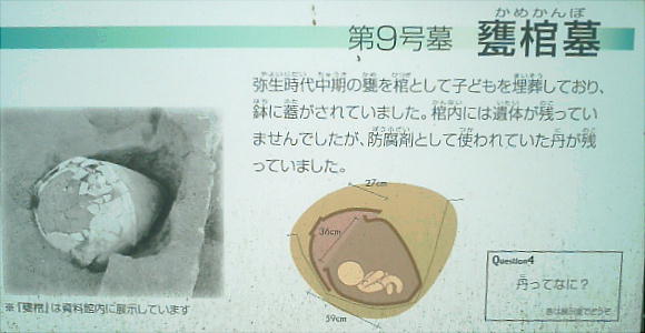 物をはじめ、住居跡や柱穴・溝などの遺構が発掘された。なかでも、木棺墓や壺棺墓等をはじめとする墓の発見は、当時まだ