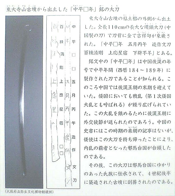 この鉄刀がそれだと言う向きもあるが、それはあり得ないと思う。東大寺山古墳の築造は4世紀後半から5世紀初頭と考えられるの