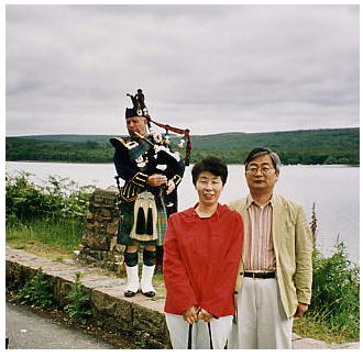 ネス湖を紹介した立て看板の脇で、スコットランド衣装をまとったおじさんがパイプオルガンを弾いていた。
