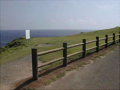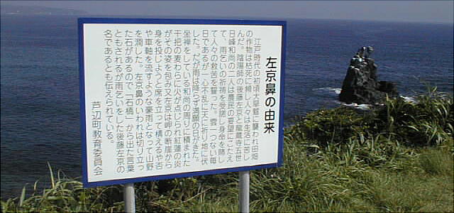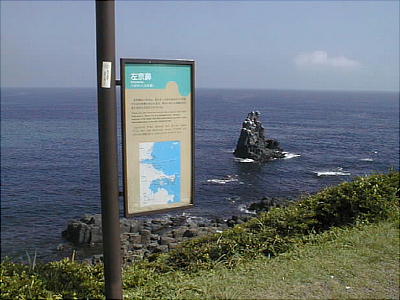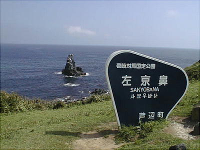 八幡半島の東海岸に、草原に覆われた岬があり、その海面に突き立った岩峰が見える。「左京の鼻」と呼ばれ、玄界灘を望