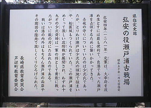 芦辺港から車で5分程のところにある。弘安の役「瀬戸浦古戦場」という史跡で、弘安4年(1281)、蒙古軍の襲来の際、