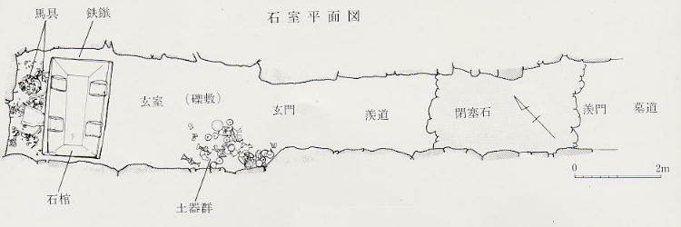 壁面はほほ垂直に積み上げる技法を用いている。床面は玄室、羨遣ともすペて轢敷きであった。石室の全長は約13.9mで、全国的に