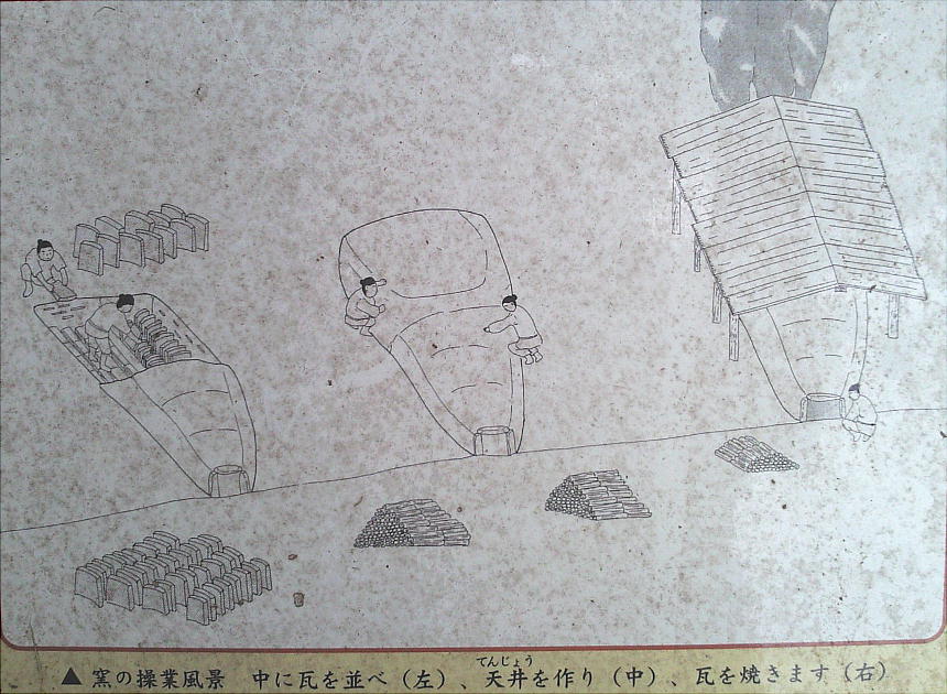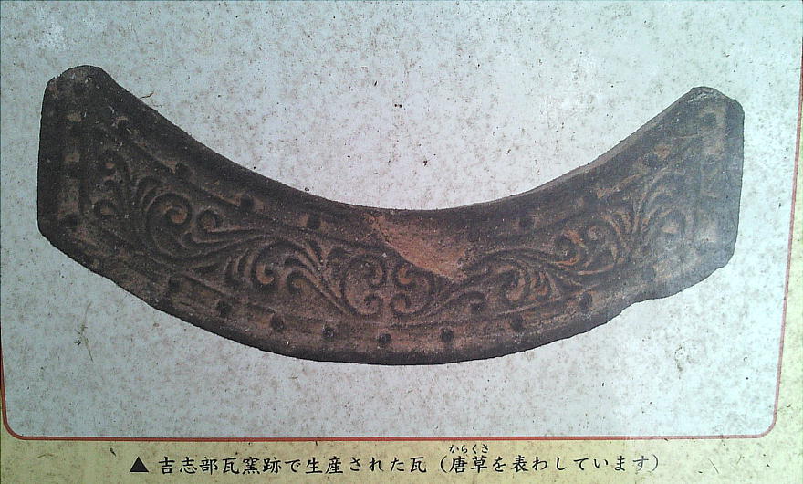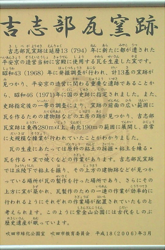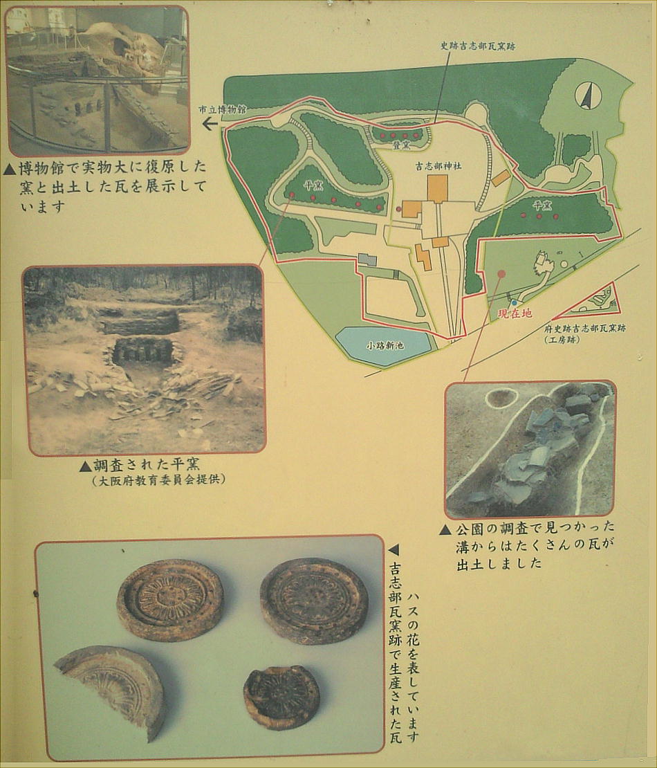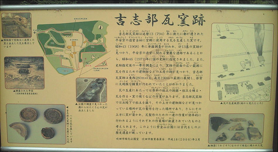 主要な吉志部瓦窯跡は吉志部神社の鳥居に向かって左側(西側)にあるが、ここは東側である。ここにも平窯が3基、丘陵の斜面に 作られていた。現在は児童公園のように整備されているが、ここのグラウンドには溝があり、そこに多くの瓦の破片や土器の破片が 捨てられていた。失敗した瓦、不要になった瓦を大きな穴(瓦溜)に埋めたもののようだ。どうやら、製造過程における様々な作業 場として使われていたのだろうと思われる。現在は道路を挟んで対面にある吉志部瓦窯(工房)跡と一緒になって、掘立柱建物跡、 井戸跡、回転台跡、粘土採掘坑等の遺構も検出され、大規模な造瓦工房の一部である。