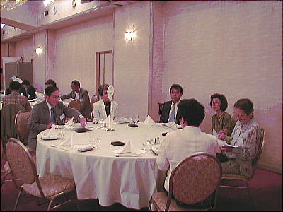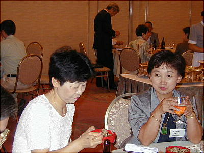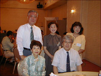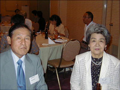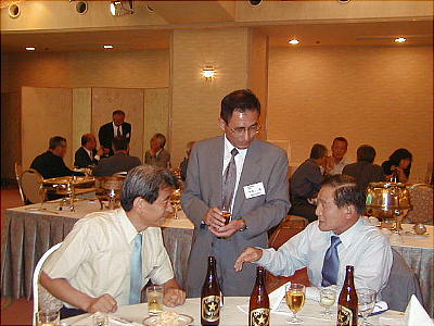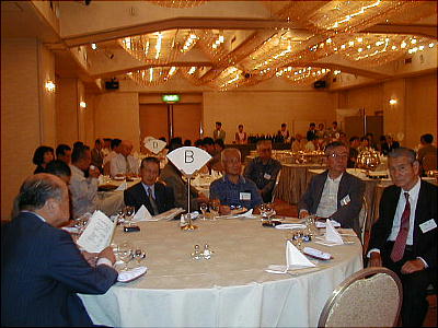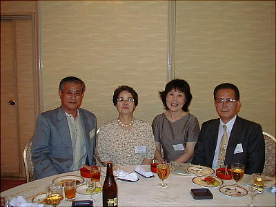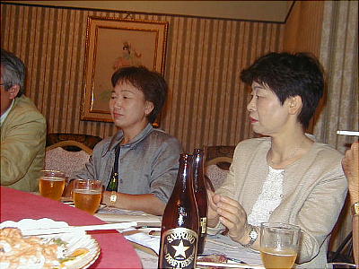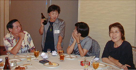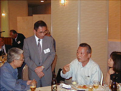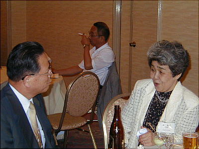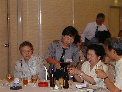 幹事年だからと、接待に各テーブルを廻る渡辺節ちゃん(21回生:上、下右)。