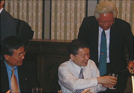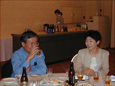 「いやあ、司会業ご苦労様でした。」と林校長から一杯受ける大隈君。 皆様、はるばる甘木からありがとうございました。