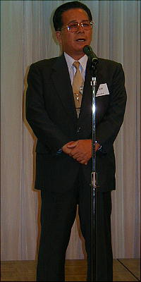 挨拶する鶴川会長(上右)。健康が優れないので会長職を辞したいという話だった。