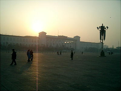 広い、とにかく広い。都市の広場としては、世界最大のものらしい。道路を挟んだ天安門前の広場の端では毎日、五星