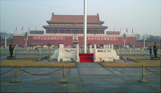 紅旗が、朝日が昇ると同時にかかげられ、夕日が沈むと同時に下ろされる。高い五星紅旗ポールの両脇には兵士が2人