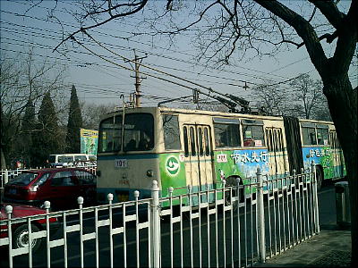 北京はトローリー・バスが全盛である。一台として同じ模様がない。ベタベタ広告が貼ってある。