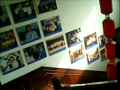 二階への階段の壁に、訪れた著名人の写真が幾つも貼ってある。箔の付け方は世界共通だね。