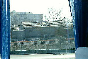 バスの窓から垣間見る胡同。下右は取り壊された胡同のすぐ裏に高層アパートがたっている。比較的綺麗な胡同は観光用に残すそうだ。