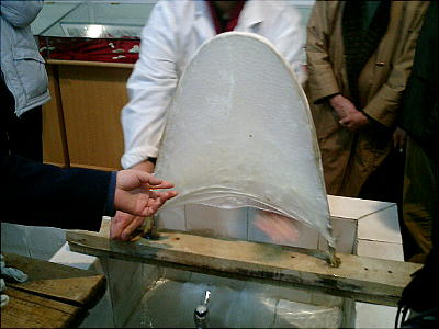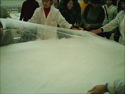 竹籤にかぶせて伸ばした絹を、さらに人力で十倍くらいの大きさに広げる。それが何枚も重なって布団になるのだ。