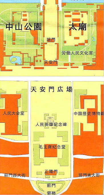 広場の東側は中国革命博物館と中国歴史博物館、西側は人民大会堂、南側は正陽門と箭楼であり、広場には人民英雄記