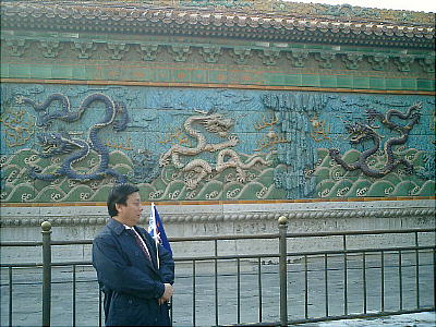 絵画館の前には九龍壁があり、写真のように、皇帝の象徴である龍が描かれた見事な壁面。長さ約30m。高さ3,5mの長い壁。