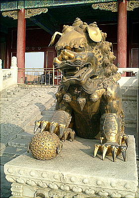 内廷の南の入り口である乾清門へ来る。左右の壁には色鮮やかな装飾が施されている。乾清門前の塗金獅子。これはメスで子供が