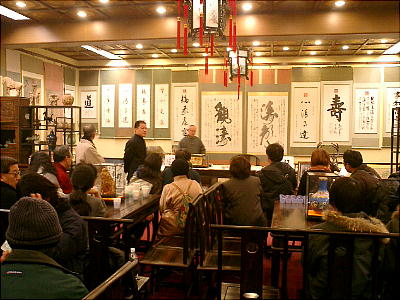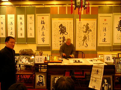 一画に書画骨董を飾った部屋があって、ラストエンペラー溥儀の甥っ子(弟の子)という人が書を書いていた。逆さまに字を書い