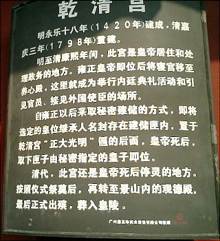 皇帝の寝室だった乾清宮である。寝室だけに、ここでは様々な物語が残されている。皇帝が官女達に襲われて首を絞められた事件