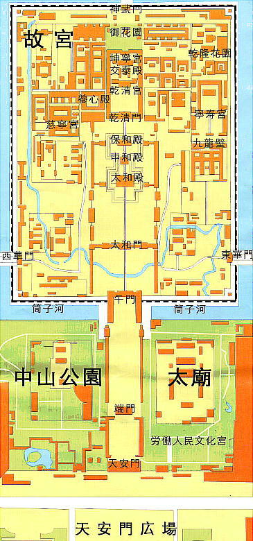 を執ったり、皇帝や皇后貴妃たちの住む後宮があった部分である。残りの東西六宮、御花園は妃たちが起居、遊楽、休憩する所で