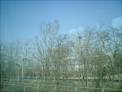 々を見ながら、北京からモスクワへ走っている国際鉄道の脇の道路に沿って、木々の間に地肌が覗く山並みを抜けていく。