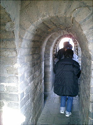 射撃孔から雄大な山並みと、どこまでも伸びている長城が見える。舗道はほんとに急で、よじ登らなければ進めないところもある。