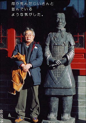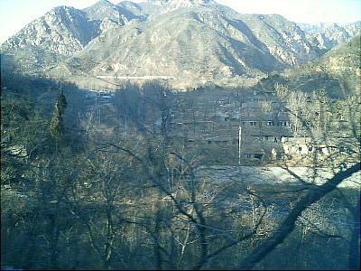 例によっての赤茶けた山々を見ながら北京市内へ戻る。この後土産物屋に寄って絹製品の加工を見た。下の写真は、北京郊外に建
