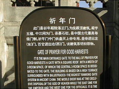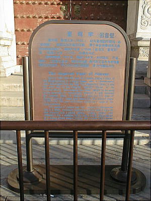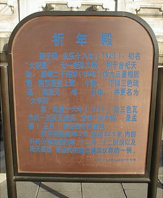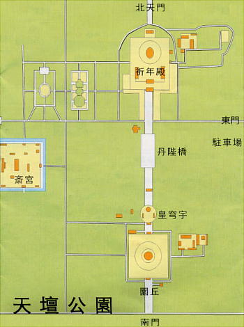 に至る。明・清二王朝の皇帝が天を祭り、祭祀を行った。現存する中国最大の祭祀建造物で、祈念殿、皇乾殿、皇穹宇、圜丘、