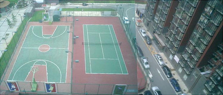泊まった部屋から見た周囲の光景。左端を鉄道が通っていて、中庭にはバスケ・テニスのコートがある。