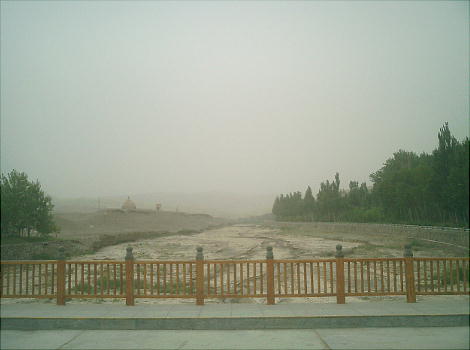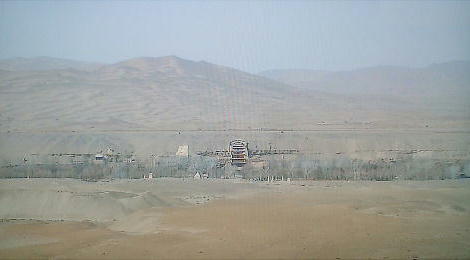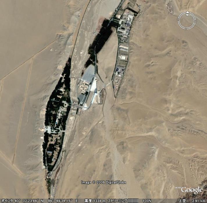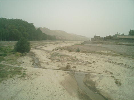 ふもとに、祁連(きれん)山脈の雪解け水が流れとなった大泉河(だいせんが)という名のか細い川が流れ、緑のポプラ林があ