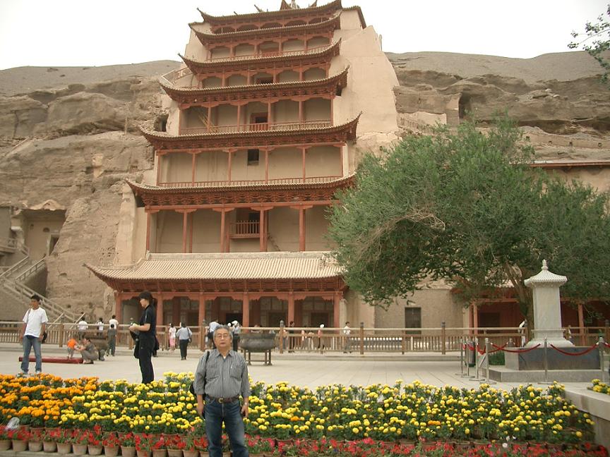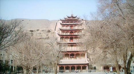 砂丘の突端に造られた莫高窟。赤い柱の北大仏殿は最初唐代に4層の楼閣として建てられ、その後少しずつ高くなり、現在の9
