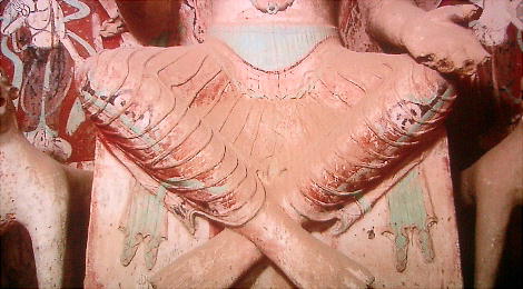 壁画には空を飛ぶ天女、すなわち「飛天」が多く描かれており、上左はそれをイメージした彫像だ。
