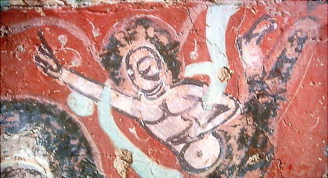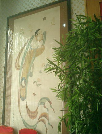 昼飯を食べた店の壁に描いてあった「飛天」と、壁一面に展開していた印の模様。
