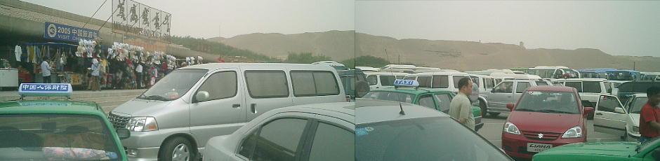 月牙泉からそう遠くない。今日も「紅旗」で砂漠の中を走るのだ。巨大な岩山に刻まれたという仏像や、洞窟の壁一面に描かれ