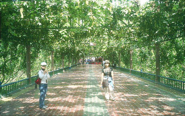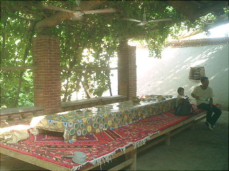 の葉の間からこぼれる陽の光がキラキラと輝いている。ハミウリ、干し葡萄などもいただいて2時間ばかり歓談する。亭主はアイ