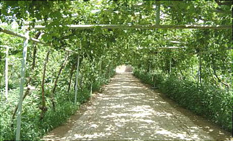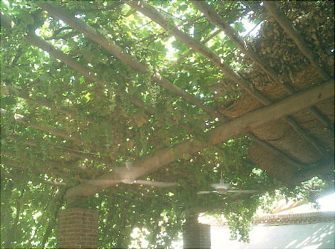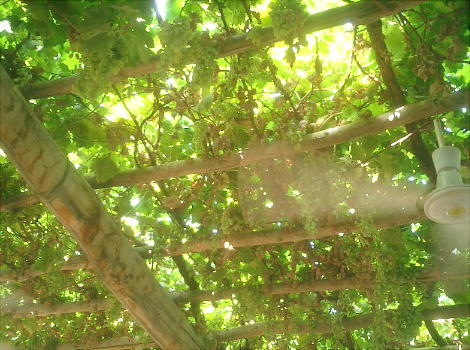 アイさんの家の中庭に下がっている葡萄棚。木漏れ日がさわやかで、「こんな所で昼寝したら気持ちいいだろうなぁ」と言ったら