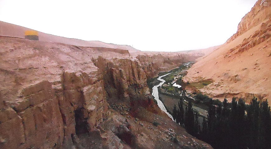 ムルトウク河をのぞむ、莫高窟のように愛想のない壁とドア、ムルトウク河のえぐった絶壁にある千仏洞。