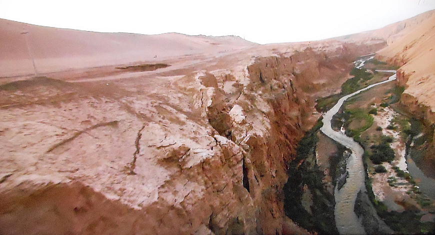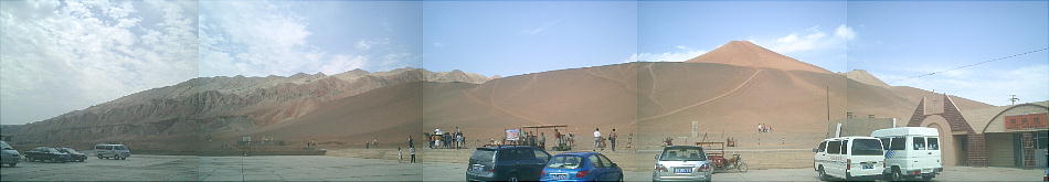 くベゼクリク千仏洞に到着する。火焔山の裏側となる。手前の土の色と奥の砂山の色 そして青い空のコントラストが綺麗だった。