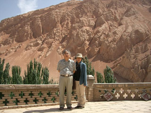重要な石窟には係員が座っているが、所在無げに暇をもてあましているようだ。このベゼクリク千仏洞のテラスから火焔山がよく