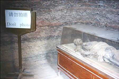 ケースに入った夫婦のミイラが完全な姿のまま残っていた。いずれも中国人ではなく、現代の西欧人に近い風貌をしていたので