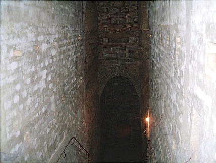 墓室は高さ3m、四方 3.5m。奥壁につけて高さ50cmほどの土台が築かれ、棺が安置されていたという場所に、ガラスの