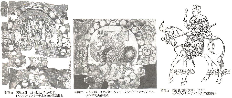 していて、その錦には円形の連珠文のなかに向き合った2頭の、翼を持った天馬が配置されていた。更に天馬を詳しく見ると、