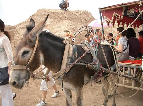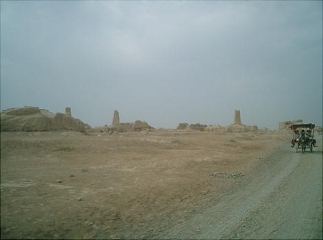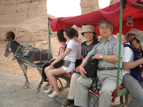 高昌故城入り口から、観光用のロバ車に乗りかえて中心部へ向かう。ロバ車の御者は、日本人観光客が多いのでカタコトの日