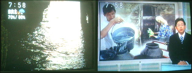 wifeが呼ぶので居間へ行って見ると、見慣れた葡萄棚や水路が画面に映し出されていた。早速デジカメで二重取りした。以下