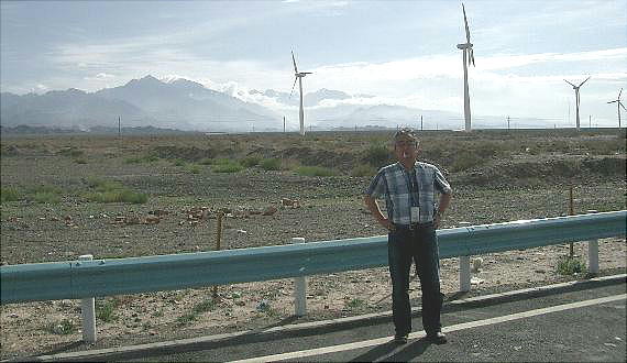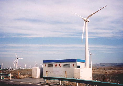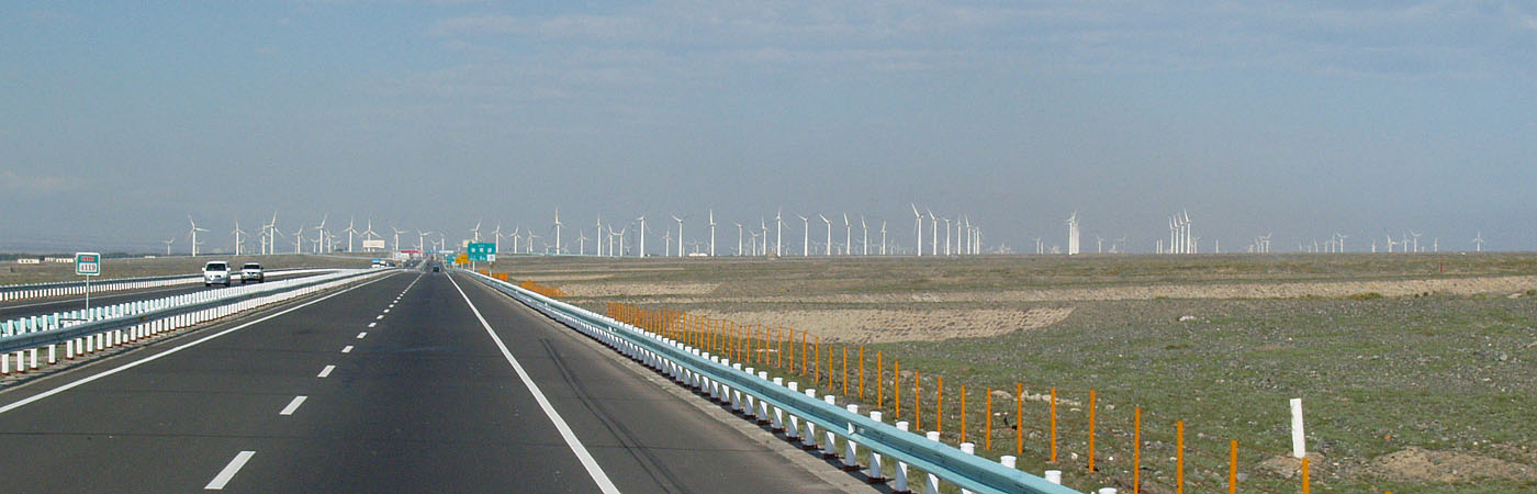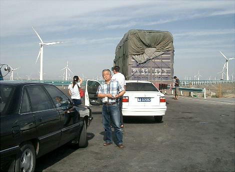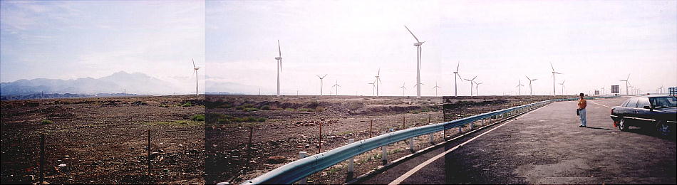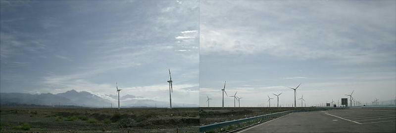 40分ほど走ると風力発電の風車がたくさん見えてきた。全部で180基もあり、アジア最大の風力発電所だという。しかし風車の