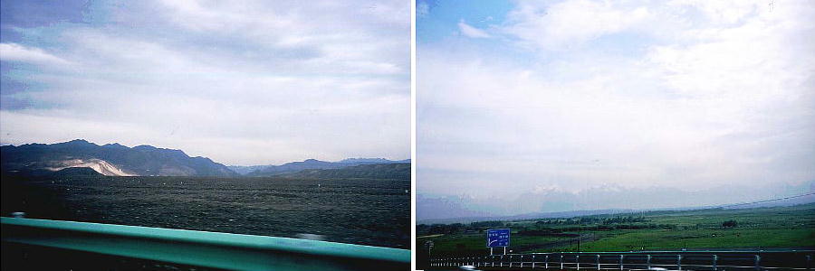 8:00朝食。朝粥。9時前ウルムチに向けて出発。天山山脈の麓を抜けていく。前後左右、見渡す限りゴビ灘(たん)の素