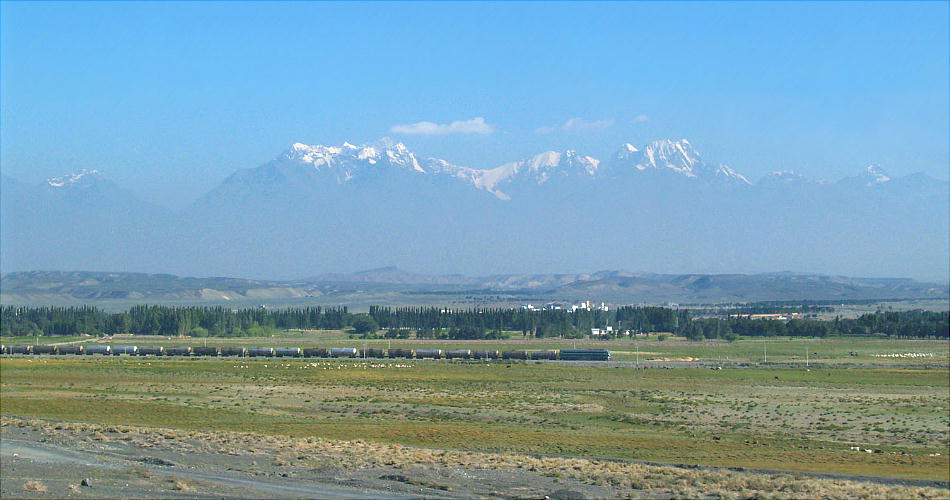 天山山脈を眺めながら飛ばす。草原や岩山や遠くには雪をいただいた天山山脈、景色はいい。天山山脈に沿ってどんどん走る。