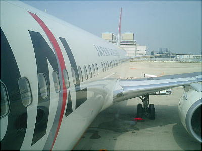 いかなる理由か、10:30出発予定が11:00の出発になる。飛行機に乗り込む。さぁ、一路北京へ。通路を挟んで横