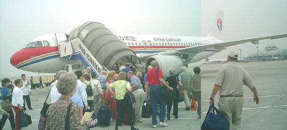 継ぎ便が遅れて、機内でずいぶん待たされた。14:30(中国時間:日本とは1時間の時差だから、日本時間のままだと