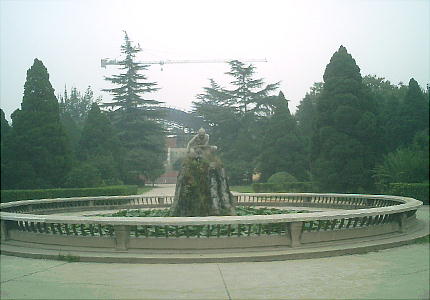 花と樹木に囲まれた半波博物館の庭の中央に池があり、池の中に築山がある。その上に一人の少女の彫像があり、少女は麻布