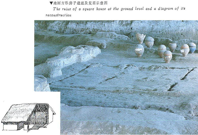 遺跡全体は面積が約5万平方米で、居住区と墓葬区に分かれている。村落の中央にあった大型長方形建物跡、早期の円形建物