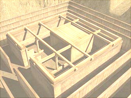 財宝を納める墓室が作られた。CG画像はその墓室の工事中の様子を復元したもの。真ん中の箱の中に棺本体を受け入